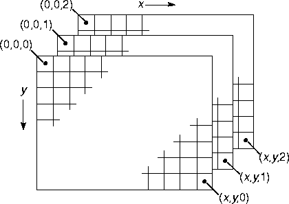Image data is, conceptually, a three-dimensional array of pixels, as shown in Figure 4-1. Each of the three arrays in the example is called a band. The number of rows specifies the image height of a band, and the number of columns specifies the image width of a band.Image Data