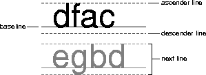 This information is used to properly position characters along a line, and to position lines relative to one another. You can access these line metrics through the getAscent, getDescent, and getLeading methods. You can also access information about a Font's height, baseline, and underline and strikethrough characteristics through LineMetrics.