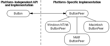 Below is a figure that illustrates how a typical AWT component (a Button) is mapped to a peer. Button peers are implemented in platform-specific classes that implement the java.awt.peer ButtonPeer interface. The java.awt Toolkit class defines methods that choose exactly which class to use for the peer implementation.