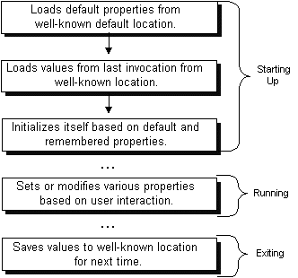 object and loads the properties that were saved from the last time the program was run. Many applications store properties on a per-user basis, so the properties loaded in this step are usually in a specific file in a particular directory maintained by this application in the user's home directory. Finally, the program uses the default and remembered properties to initialize itself.The key here is consistency. The application must always load and save properties to the same location so that it can find them the next time it's executed.