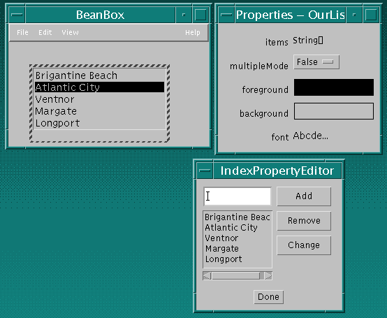 demo Bean illustrates how to use an indexed property.OurListBox